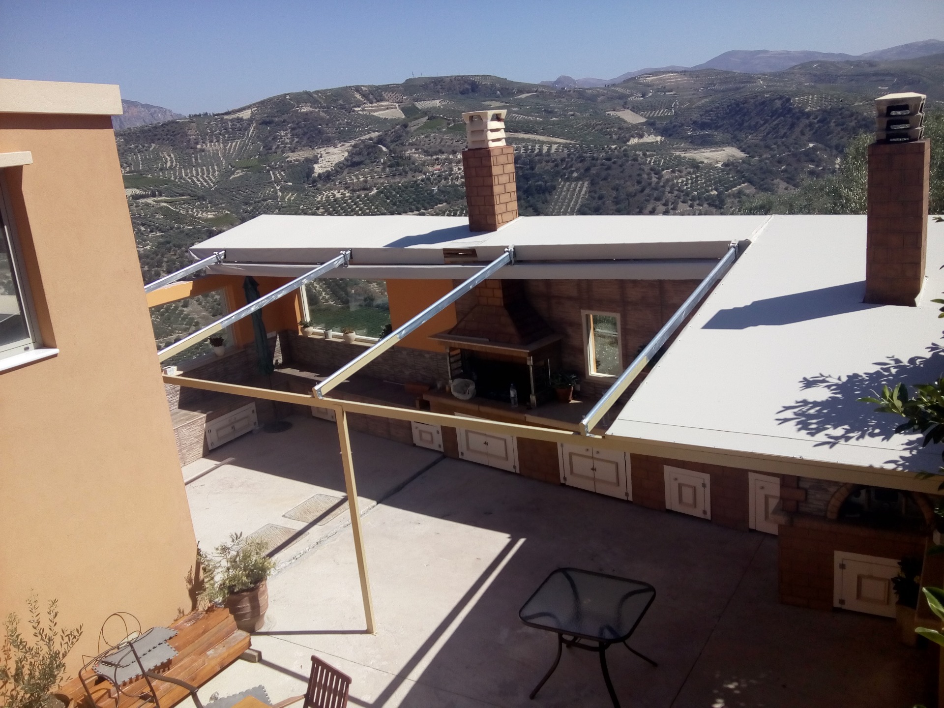 Μια πρωτοποριακή ιδέα για γωνιακές καφετέριες που εδώ και χρόνια ήταν το μεγάλο πρόβλημα κάλυψης σε γωνίες..ομπρελοιδες κατασκευή -πτυσσόμενη σε περίπτωση χαμηλού ύψους ανοίγει και κλείνει όπως μια κανονική ομπρέλα....μόνο από την εταιρία τεντα και τεχνη Ανδρεαδακης Μαρινος..